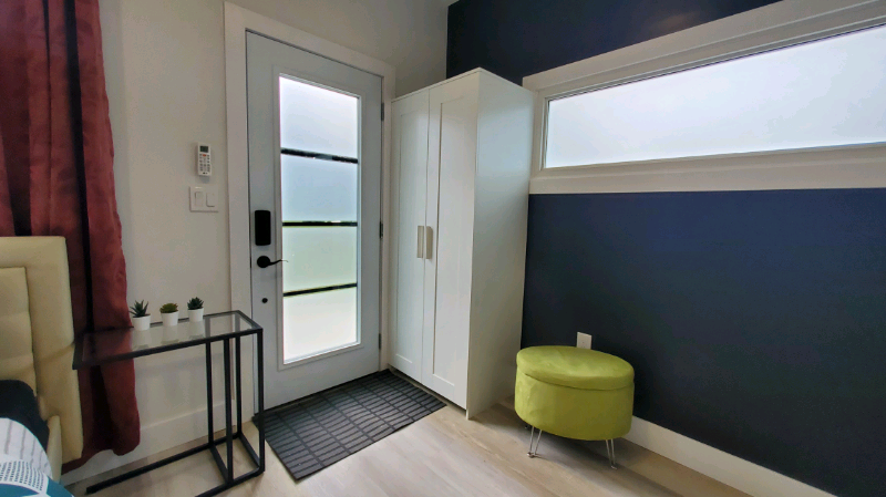 Luxurious 5 Star Features: Professional interior design, modern front entrance, extra high 9.5ft ceilings, premium queen mattress, 50in Smart TV (Netflix & Roku apps pre-installed), porcelain tile accent walls, stainless steel appliances, in-suite laundry, outdoor patio set, 2 parking spaces included, housekeeping service option and grocery service available for long term stays. Located in a quiet and beautiful neighborhood.
