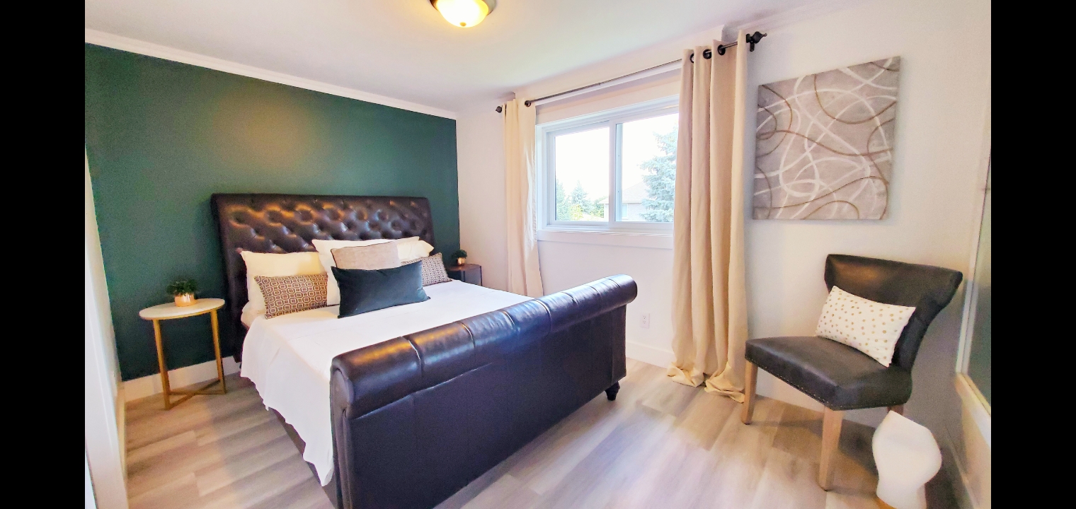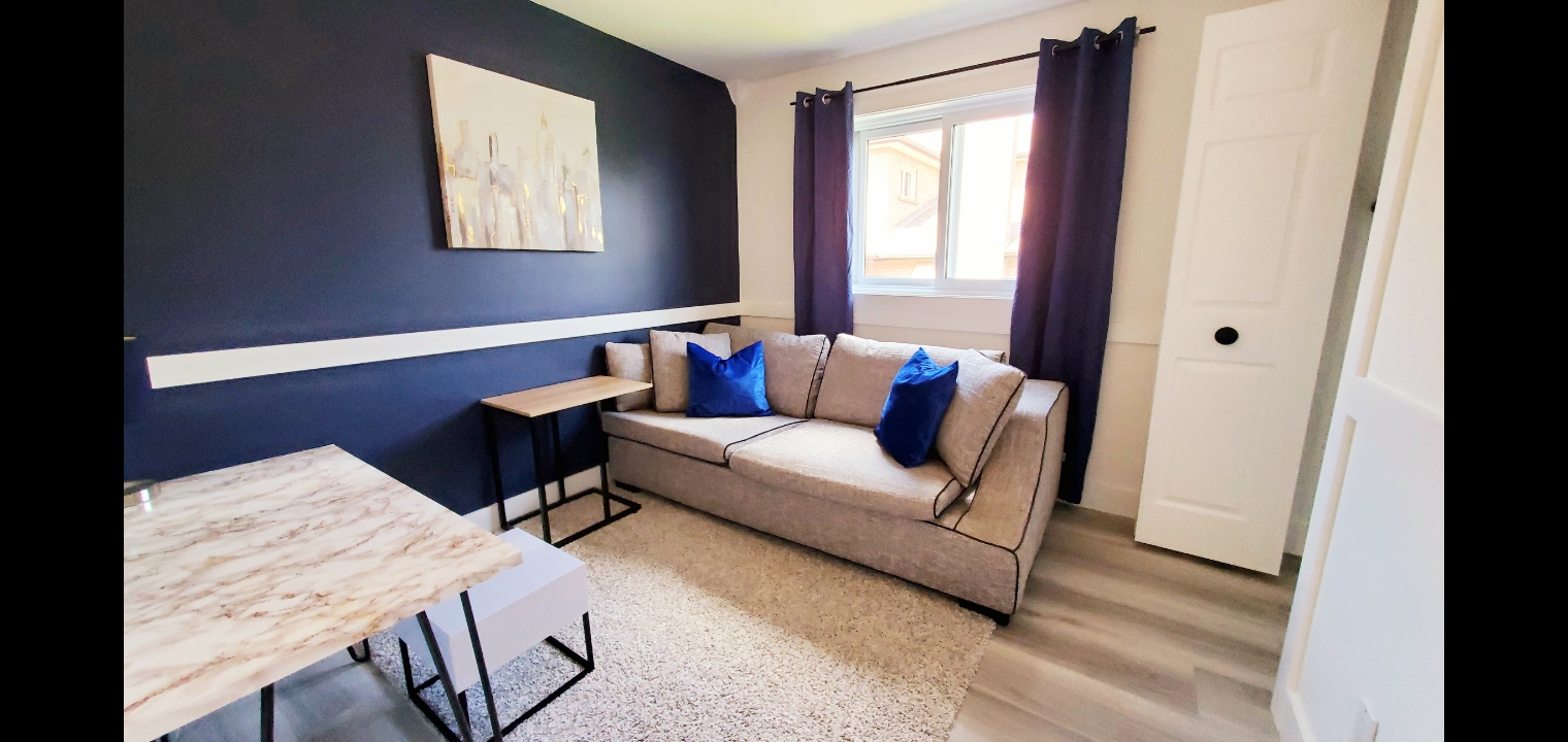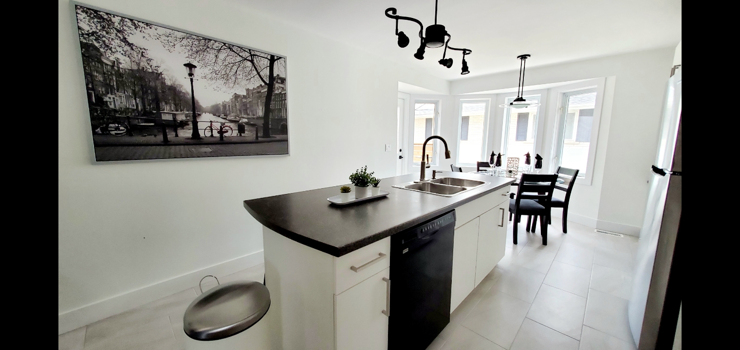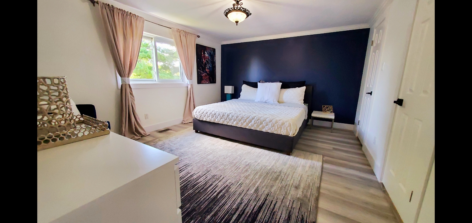 This gorgeous luxury unit contains 1 master bedroom with a KING SIZE bed plus a walk-in closet, 1 regular bedroom w/ a queen-size bed, and 1 office with a twin-size sleeper sofa. This unit was renovated in 2020 and contains all of the amenities you need to enjoy your stay in Kitchener. The Luxe Home is a premium 2-level home in an excellent neighborhood. It is located just 4 minutes away from the Boardwalk Plaza. This apartment features a large kitchen, home office/flex space, huge master bedroom, plenty of natural light, and all of the modern touches you expect from a space.